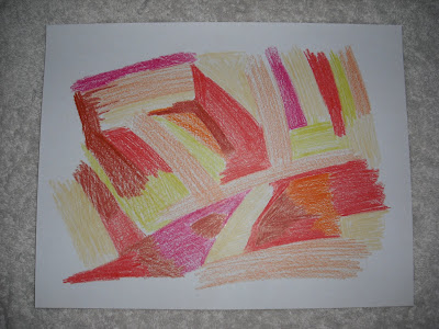 Begin by choosing colored pencils. I picked reds, yellows, oranges, and browns because they reminded me of the color of the clay the Greeks used for their vases. Cover your sheet of paper with color. Mix it up. Color large patches of yellow and small patches of brown, circles of orange and triangles of red. Go nuts.